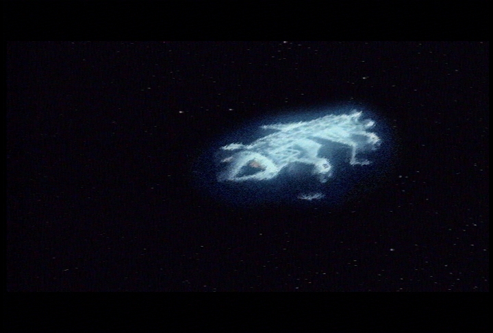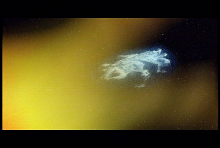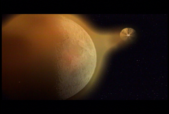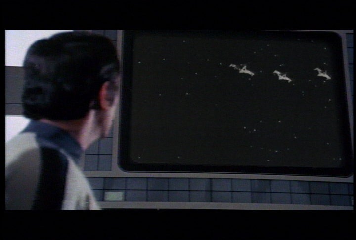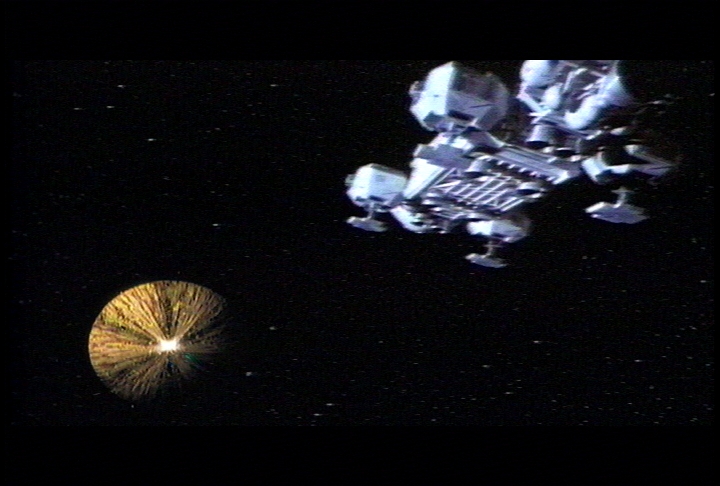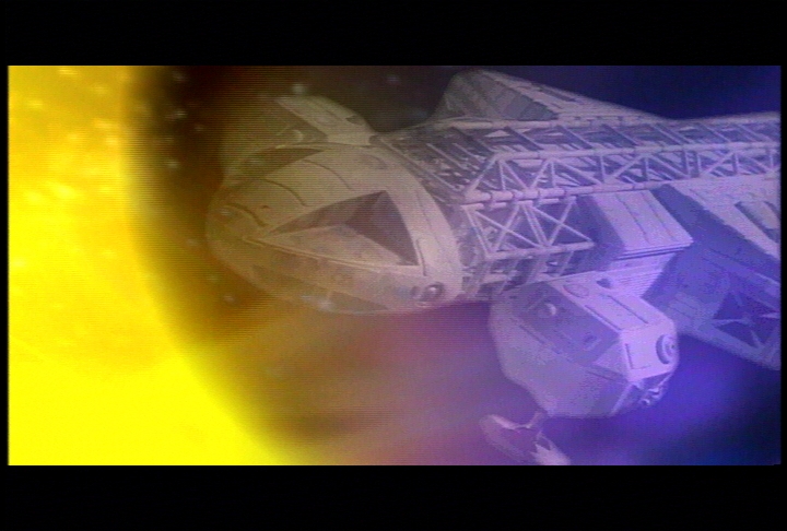 So after the opening credit...the first scene is from "The Last Enemy" (let's forget the Hawks) and then we are coming back in the "War Games" episode. I have used what I had to change the spaceship, which are scenes from Buck Rogers (picture 45) using their Draconian Marauder fighters. I began to work on it in July -- and the MainMission:2000 con was in September (2000) -- so I didn't have time for new CGI effects. This episode (that I decided to call "God's Will") was going to be a surprise at the con.
